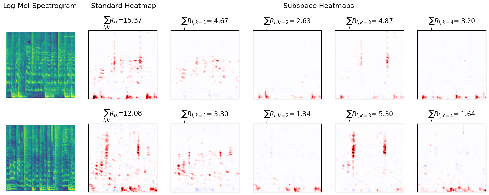 Provided are two exemplary samples of hip-hop music along with the extracted explanations. The standard heatmap specifies the local explanation as obtained with standard LRP. The subspace heatmaps represent the disentangled explanation-components as extracted with DRSA and LRP. In order to enable good visual inspection, the audio players for each explanation are provided in collapsible sections below the figure.